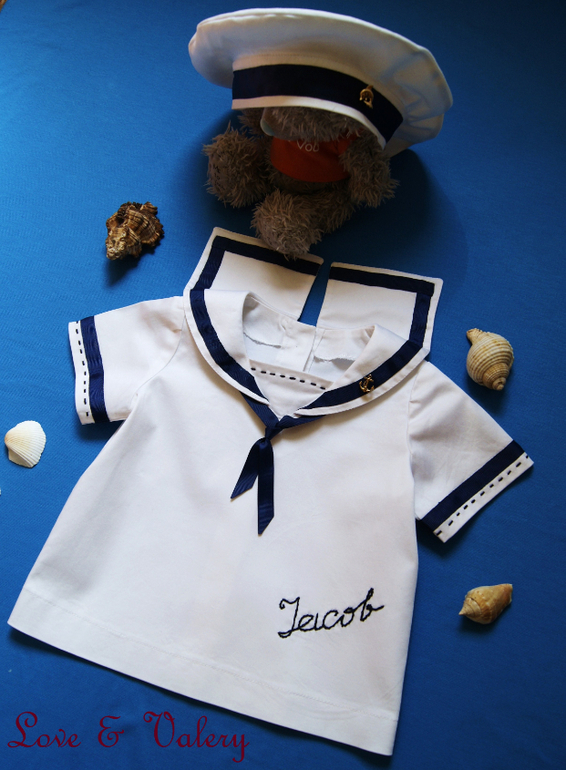 Еще один вариант "маленькой морячки" из очень тонкого, мягкого, белого поплина для малышки на жаркое лето или отдых на море. (шила на заказ, 86 размер). Комплект украшен репсовой лентой, бантами и пуговками "якорями". Воротничок, манжеты, планка и ободок береточки укреплены дублирином. Под бантом на полочке потайная кнопка.