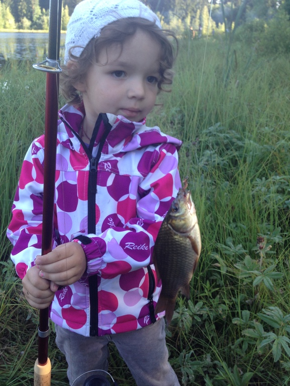 На днях ходила с папой на рыбалку словила маленького карасика) Всех отпустили,обратно в реку.