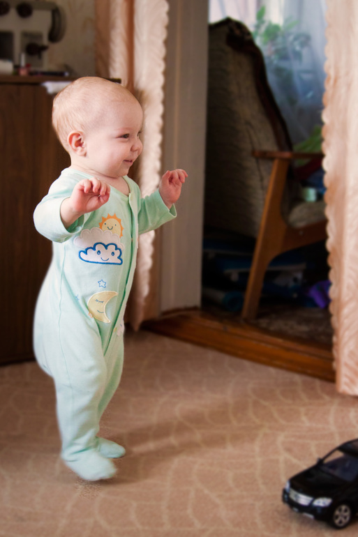 Ходит уже очень уверенно, встает без опоры и поворачивает на ходу. Через пороги переходит, а не переползает :) И теперь не ползет, а идет на четвереньках. Это тааак ржачно выглядит!!!!!!!