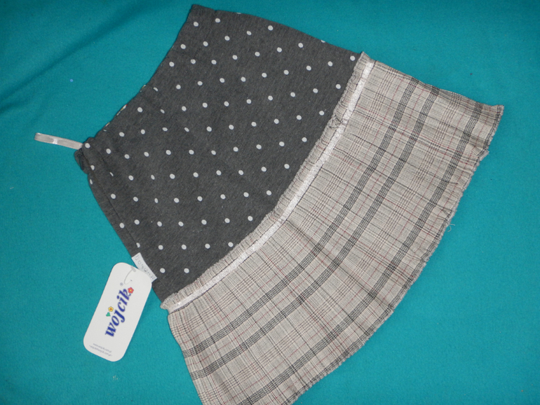 Юбка на молнии - верхняя часть трикотажная, серая в горошек, нижняя часть - гофрированная, отстрочка розовой лентой.