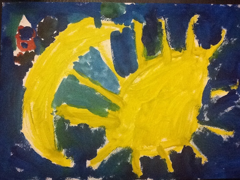 В процессе работы решил закончить все без разукрашивания ракеты. Я говорю, дорисуй до конца. Он - нет, завтра дорисую. Я: нужно довести рисунок до конца, закончи свою картину. Макс: Нет!!! Я сказал завтра, мне надо именно завтра закончить! ( спорим так минут пять)
