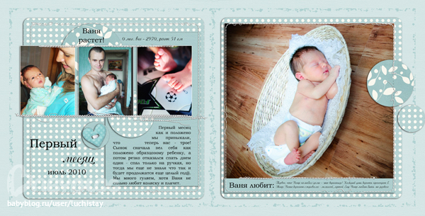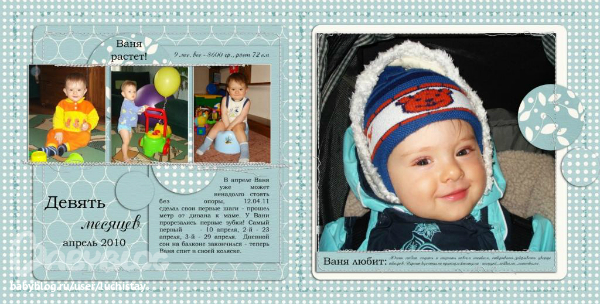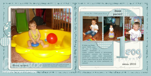 Наконец-то я созрела! Все не находила в себе вдохновения, желания.. не знаю прикрывалась нехваткой времени, в общем не хотела писать. А сейчас почувствовала - пришло и время и желание делать записи о себе, своей семье, аншей жизни, и о всяком-всяком. Начну с того что очень уж быстро поплетело полдекртеного отпуска - бац и сыну уже полтора)))) Зовут на работу, а мне и не хочется и возможности нет. Сын в свои полтора совсем невзрослый - очень мамин, очень титин мальчик. Без меня ненадолго остается с папой или бабушкой, но - ест очень плохо, спит также. Жду - когда же он повзрослеет и станет чуть самостоятельным. В общем надеюсь к осени все будет по-другому, сможем попасть в сад и тогда - привет работа. А пока есть возможность выкраивать минутку другую на свои дела и увлечения. Когда мы готовились справлять первый Ванин день рождения я тут на беби блоге узнала про цифровой скрапбукинг - и меня что называется засосало))) Сейчас параллельно делаю три книги (о как за полгода выросла!!!) - 1. для подруги книга с Мальдив - захлебываюсь слюной!