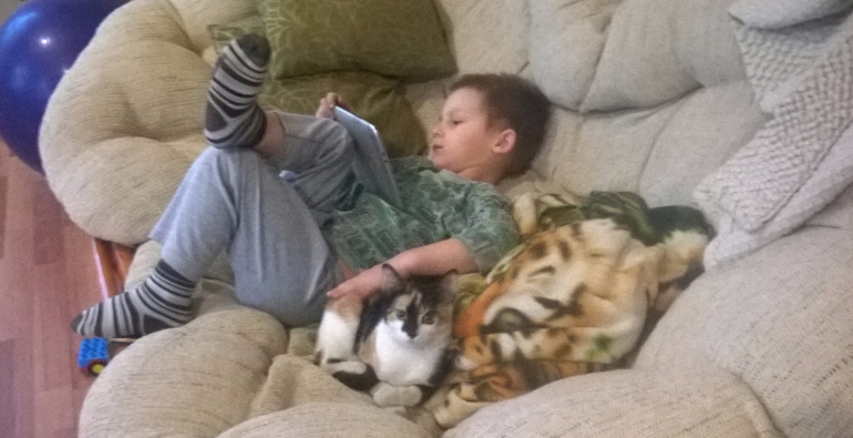 С тех пор, как кошка начала нас терпеть, детский день начинается так: