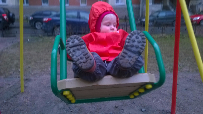 У нас опять дождь, старший в саду, дочка ходит кругами и твердит :"Гать, гать..." (это "гулять" на её малышковом, к слову, она начинает рваться на улицу прямо с утра, и целый день только этими мыслями и живёт, представляете каждые полчаса "Гать, гать..." и сапоги тащит, гулёна, блин). Я надеваю на неё наш волшебный непромокаемый костюмчик и выходим на площадку. А тааам тишина, пустота. Бедные детки, наверное, сидели по окнам и на нас любовались-завидовали. Хотя любоваться особо не чем было: сначала минут двадцать Яся качалась на качелях (я даже крепко так задумалась, забыла, где нахожусь, бывает же! на площадке уйти в себя на 20 минут!), потом я уговаривала её повеселиться в луже, она немного ногой в ней поковырялась, посмотрела на меня, видимо, подумала:"Где же мой брат, куда ты его дела?", и пошла опять на качели. ))