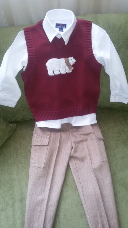 Размер 5.Одевался 2 раза. Костюм просто чудо. На жилетке у мишки шарфик из такой ткани, как и брюки.