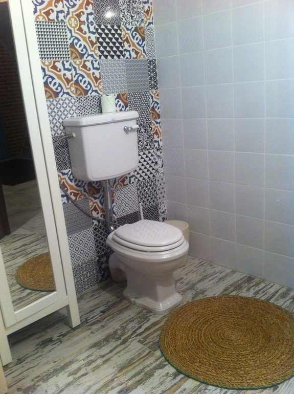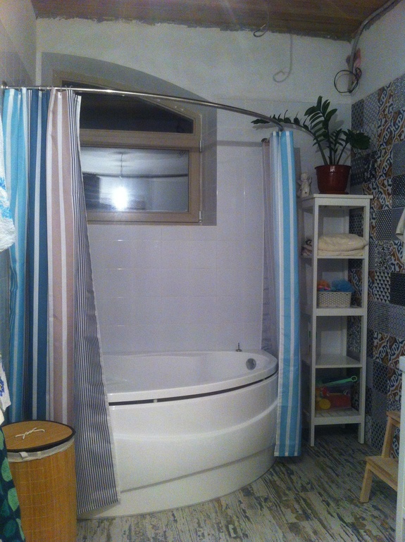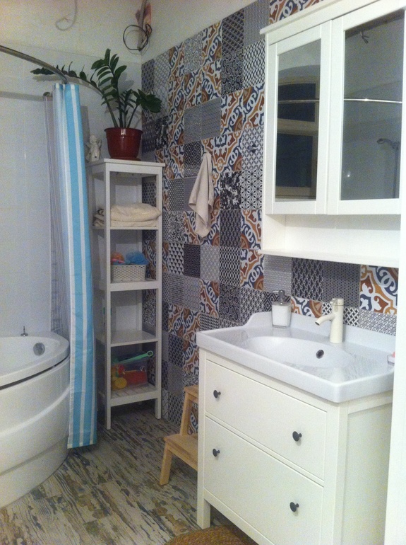 Позитивная комната ! Плитка мечта ! И пол - мечта ) . И уже писала , но повторюсь , окно в ванной моя особая мечта ) . В общем , эта комната в твоём доме - сбыча моих Мечт! Шторы на ширму лучше однотонные , я бы посоветовала . Активная плитка и фактурный пол , спорят с полосатыми шторами .