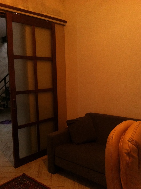 Маленький диванчик, но он раскладывается вперед и могут поспать два не толстых человека ) над диваном на стене можно увидеть мишины дизайнерские пробы пера, вернее, фломастера)))