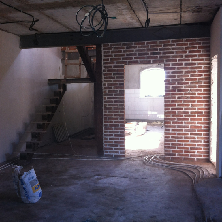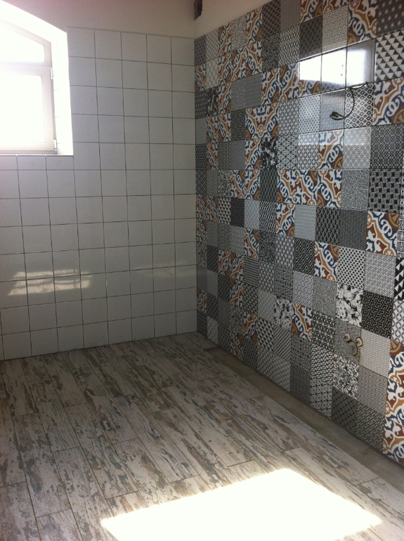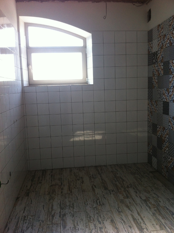 Выложили стены санузла 1 этажа, такая же плитка будет и на полу. Почему-то цвет зеленоватый, хотя на самом деле серый.
