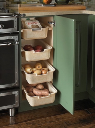 Вы не увидите овощи в сетках, которые хранятся в дорогой мебели. И это далеко не выдуманная ситуация. В жизни мы не раз слышали о подобных случаях. Так, например, в одной элитной квартире с хорошим дизайном мешки с картошкой лежали в овощных сетках в итальянском кухонном ящике. Дизайнер не до конца продумал проект и не учел все важные детали. Чтобы такого не происходило, наши дизайнеры продумывают специальный отсек для овощей. Это и практично и эстетично одновременно.