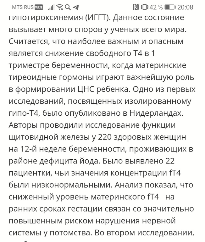 БеременностьПересдала я сегодня из своего упрямства т4 св и ТТГ. ТТГ и ат к ТПО пока не готовы. Но зато изучила исследования , где отслеживалась зависимость уровня тироксина (т4) при субклиническом гипотиреозе и нарушения нервной трубки плода. Само повышение ТТГ никак не влияет на развитие, он лишь указывает на дисфункцию щж, которая , вероятнее всего понижена. Тироксин нужен плоду до 15-16 недели гестации , в это время его собственная щж начинает функционировать. Поэтому пугает именно снижение т4 у матери на ранних сроках.
