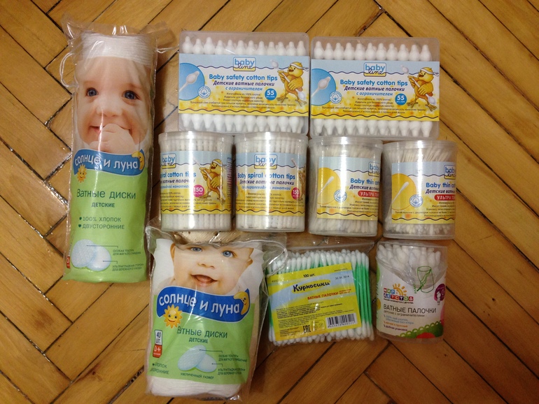 Ватные палочки(разных диаметров, сограничителем и без), ватные диски (разных размеров):