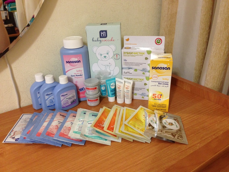а)sanosan (получила на фестивале беременных и младенецев): шампунь, средство для купания, присыпка и средство для загара с защитой 50 и много-много одноразовых пробников;