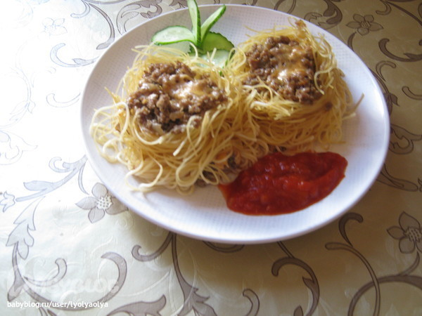 Обжарить на сковороде мелко нарезанный лук, фарш, посолить, поперчить (можно до полуготовности).2Полученный фарш разложить в гнёзда.3В мультиварку налить воды, подсолить+томатная паста.4Выложить гнёзда, посыпать сыром. Поставить на режим «рис», доливаем воды, если понадобится (гнёзда должны быть в воде наполовину).