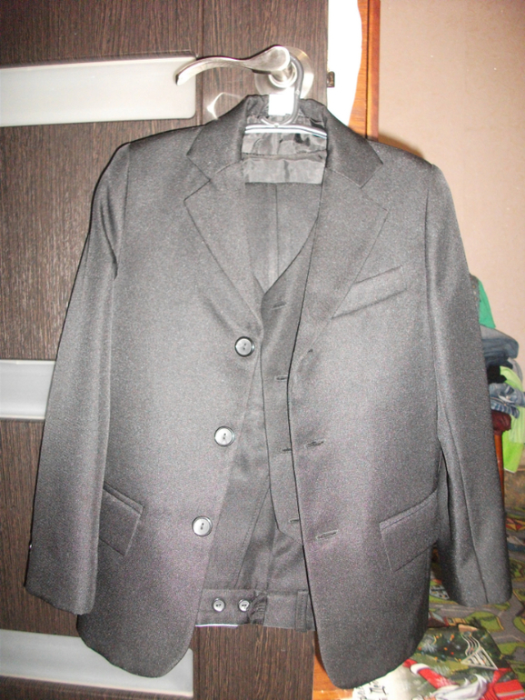 Костюм тройка. Фирма долфин. Чёрный пиджак и жилетка мало б/у, брюки носили активнее. Есть небольшой деффект- внизу на сгибе чуть потёрлись. Отдам за 800 руб.
