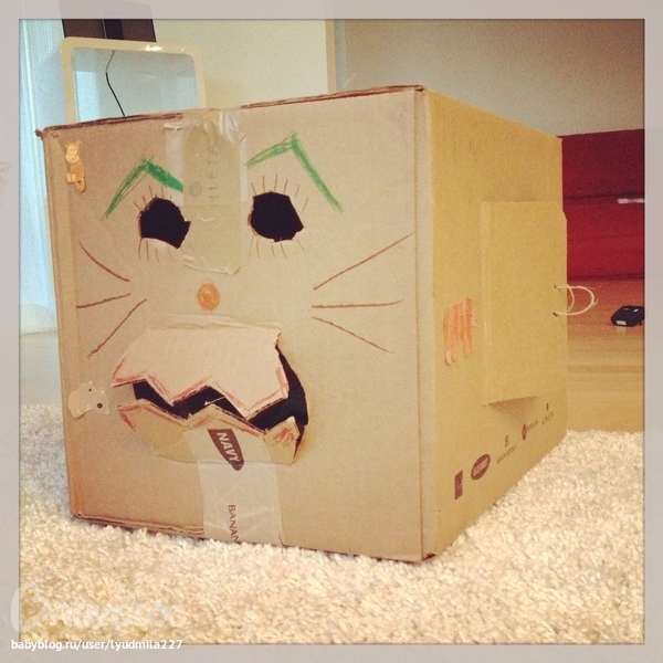 Замечательный монстрик поселился у нас дома. Пусть и не шедевр, но ребенок его обожает. В целом тема коробок у нас любима. Но раньше я все домики из них делала. Дверцы и окна вырезали, вместо машинок по дому за веревочку возили ( и до сих пор с упоением возим). Наклейками очень любим обклеивать, карандашами разрисовывать( к слову у нас уже миллион коробок таких скопилось. С нетерпением ждет новых посылок, чтоб что нибудь сотворить из коробки. Со временем домики сыну поднадоели и я вычитала, что можно личико еще вырезать! Теперь это наш новый хит! Все что плохо лежит, тут же переносится в рот или глаз монстрику))) А недавно дырочку новую проделали и туда шланг из конструктора воткнули. Теперь это не только монстрик/домик, но еще и заправочная станция! Короче, полет фантазий может быть безграничен.