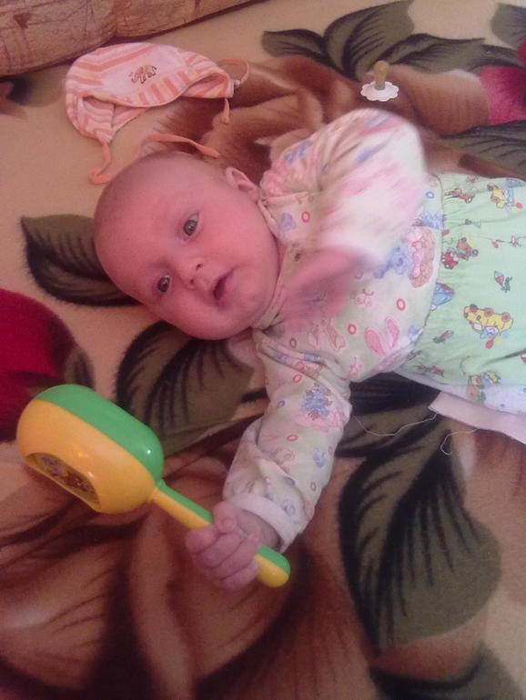 Держит погремушку только когда начинает сильно ей махать а то и в лоб себе пугается тогда, следит за игрушкой, с растяжкой играет задевает игрушки разговаривает с ней.