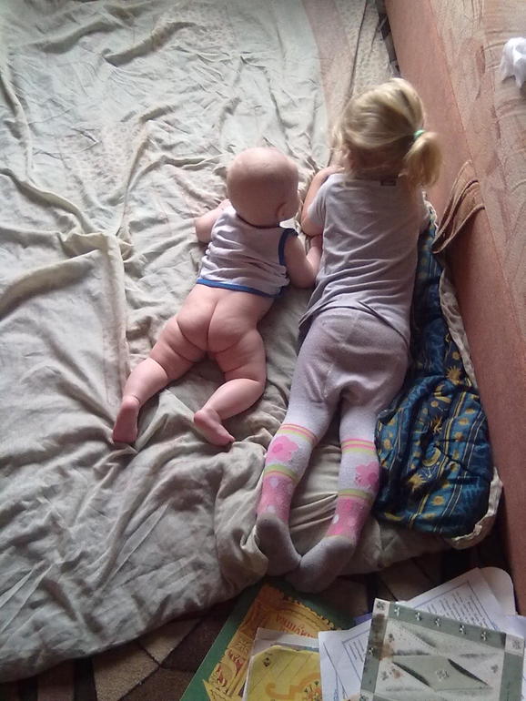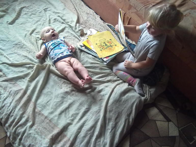 Что ещё много агукает,смеётся особенно над старшей когда вместе играют.