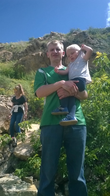 с папой. Лазали в горах и Рому протаскали с собой на руках,, что было очень удобно и страшно за него.
