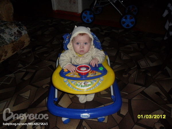Привет всем! давно не писала и не читала вас весна много хлопот,забот,больше гуляем щас с дочей.Итак нам 9го было 7 месяцев уже большая стала такая прикольная.Сидит сама играет с игрушками,перебирает их расматривает,в дудочку куда нужно дуть в рот берёт интересно так наблюдать за ней.В ходунках бегает по всему дому,уже открываем шифонер и достаём там всё,шкодим уже,начинаешь спрашивать Лера что делаешь опускает голову так прикольно.Ещё не ползаем но пытаемся думаю месяцев в 8 поползём. Едим мы творог,пюре,смесь,сок пьём,кашу едим,куриный желток пару раз давала,и начинаю смесь заменять на молоко коровье. На улице любим гулять уже не спит как раньше смотрит кругом.Весим мы 8кг рост 67см.Вроде всё что вспомнила и фото наши