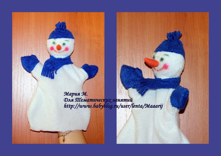Наткнулась сегодня в интернете на чудесный сайт!!! Там нашла выкройку снеговик на руку, составитель выкройки, как поняла я Татьяна Браженкова, я безумно благодарна, что человек выкладывает выкройки в общий доступ, и теперь мои дети играют таким сказочным героем!