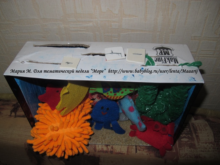 Прорежьте вдоль верхней части коробки отверстия. К ниточкам с рыбами приделайте пуговицы (или как у меня обычный плотный картон прошитый в несколько слоев). Теперь можно, перемещая пуговицы вдоль отверстий, менять положение обитателей нашего моря!