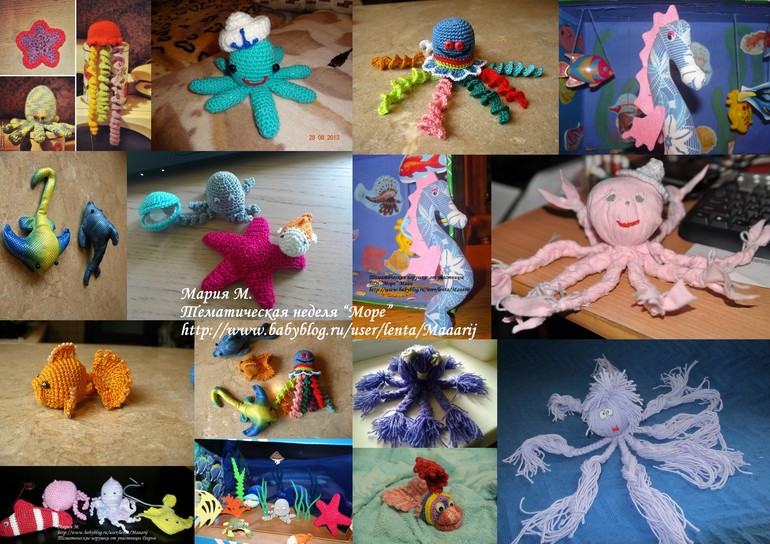 Предлагаю сделать самим игрушки тематические! Это могут быть - рыбки, или осьминог из пряжи, или звездочка, кит или черепаха! Фантазируйте, а главное наша игрушка может сама рассказывать малышу, про себя и других обитателей морей! Сшить можно из вещей, из которых наша малышня выросла уже