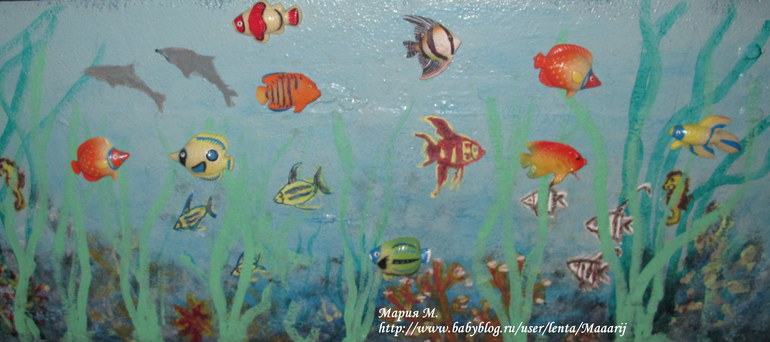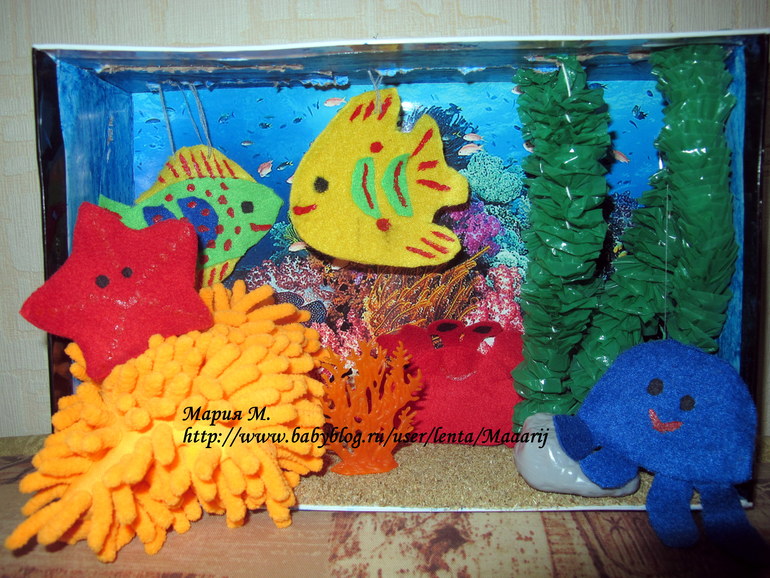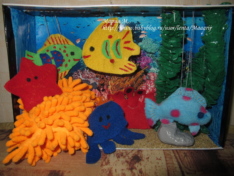 Нарисуйте или сшейте морских жителей - например, рыбку, крабика, морскую звезду, медузу и т.д Можно так же добавить водолаза и русалку :-))). На некоторые ниточки прикрепленные к рыбкам (водолазам) можно нанизывать бусинки, имитирующие пузырьки воздуха.