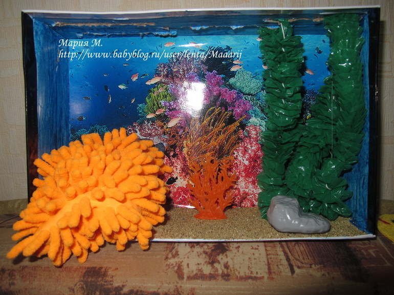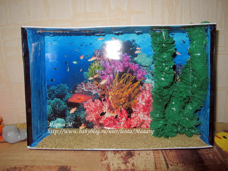 По возможности приклейте на дно камушки или ракушки. Украсьте дно бумажными или пластилиновыми водорослями.