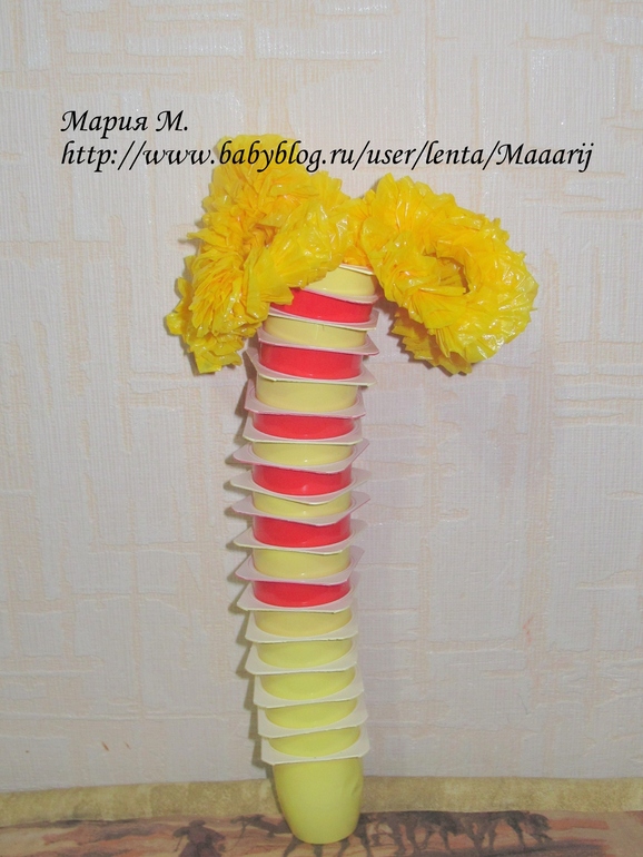 Для этого нам нужны стаканчики, из-под йогурта или обычные пластиковые бутылки, с обрезанным дном. Одеваем, друг на друга, и вверху вставляем что-либо напоминающее листья.