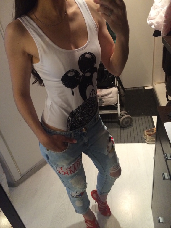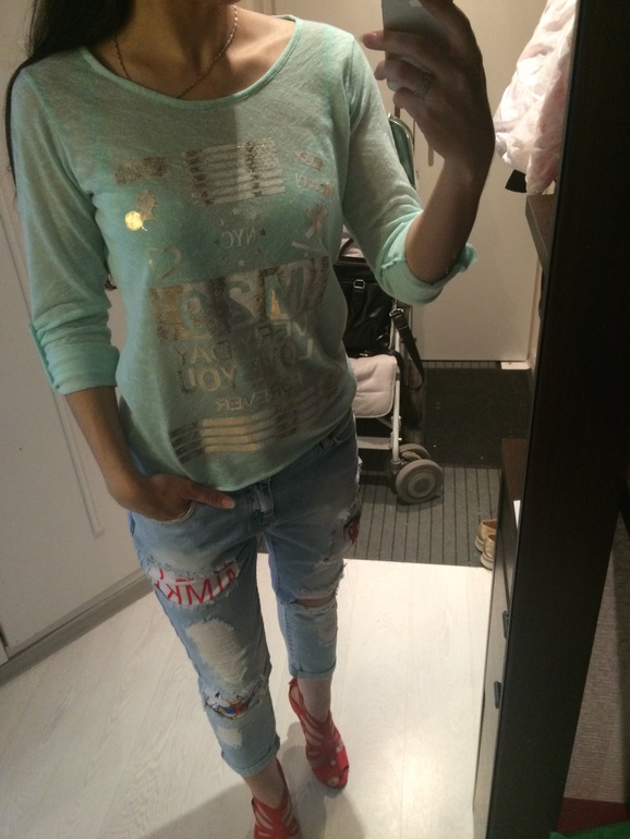 у меня футболки S, костюмы S, бойфренды 27, джинсы 100% cotton 28, брюки-лосины 26