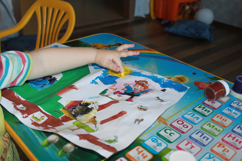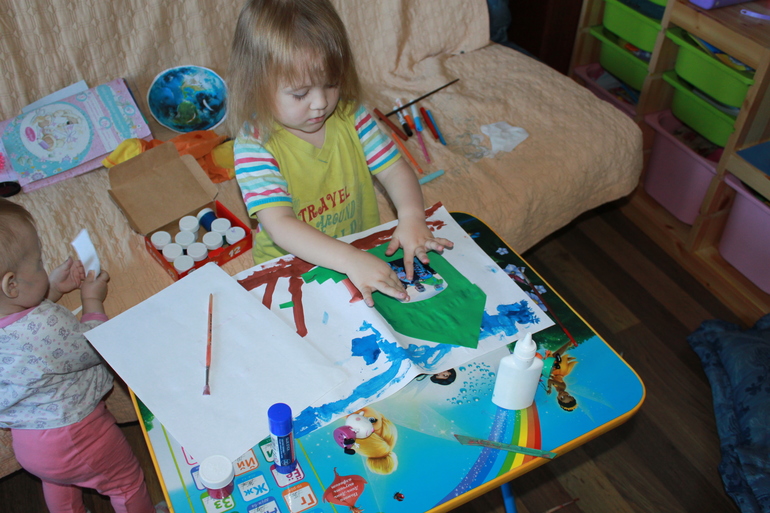 Варя не сразу поняла смысл, тут мне вспомнилась песня бременских музыкантов, и дело пошло на Ура. Варюша весело напевала "Наша крыша - небо голубое". Видимо очень громко, потому что проснулась Алиса, и дальше мы уже творили втроем. А точнее я ловила Алису что бы она не наелась клея, или еще чего-нибудь не съедобного.