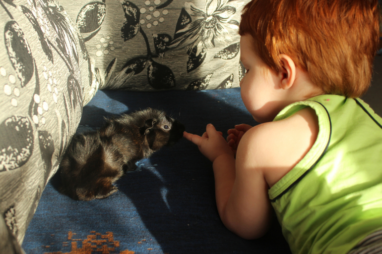 Сегодня фоткала Костика с нашим свином, он у нас заметно подрос, раза в три наверно! Такой интересный, сегодня игрались с Костиком, тот его хотел взять, а Джимик подпрыгивал, в момент косании руки, на всех четырех лапах, вместе под пледом прятались))))) Держать Костику Джимика я не разрешаю, т.к.тот сильно сдавливает животик, поэтому Костик довольствуется тем, что я сажаю его ему на коленки))))
