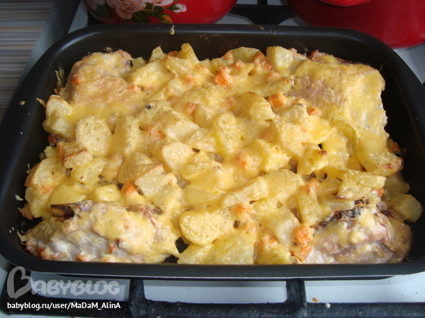 Готовится все также как обычно обвалакыввем курицу и картофель в майонезе с перцем, затем кладем все на лист(его нечем не смазываем) можно еще добавить морковку как у меня, и ставим в духовку на 30-40 минут потом посыпаем блюдо тертым сыром и в духовке еще на 5 минут)))
