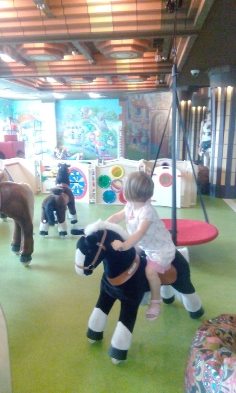 Можно покататься на таких лошадках. На втором плане развивающий городок с элементами Монтессори для детишек 0-3, и пуфы для их родителей.