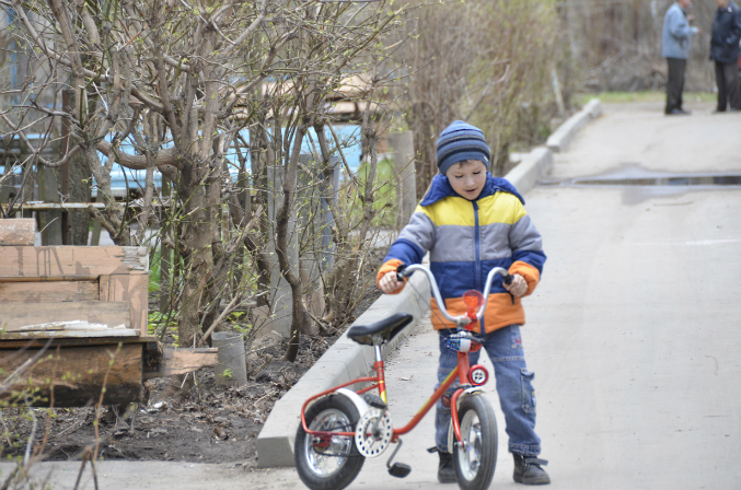 первый раз сел - даже забыл за зиму как с места трогаться. (и кто говорил, что на велике невозможно разучиться ездить?) но на второй раз уже нормально стал ездить. Довольный как слон, что у него получается, рассекает по всему кварталу. Заскакивать на большие бордюры не получается(и не получится с маленькими колёсами), а вот соскакивать - пожалуйста. Прохожих объезжает, на дорогу не выезжает. Короче молодец!