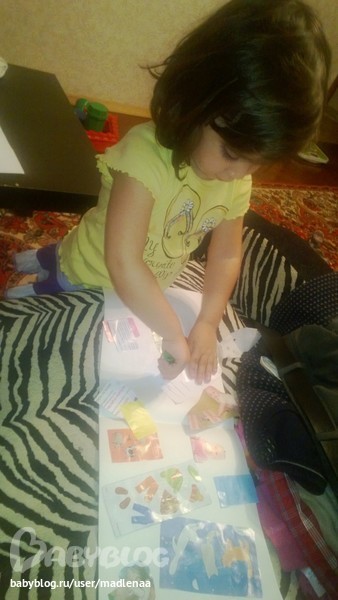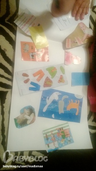 Насобирали рекламки в магазинах, достали старые журналы,газеты и вуа ля-ребенка не слышно боольше часа. Выразет-клеит-любуется) Это хорошая тренировка и для Муркина, Сафия показывает ему на картинку и рассказывает что это, какого цвета..он внимательно слушает, тыкает пальчиком, отвечает (как может) на ее вопросы.