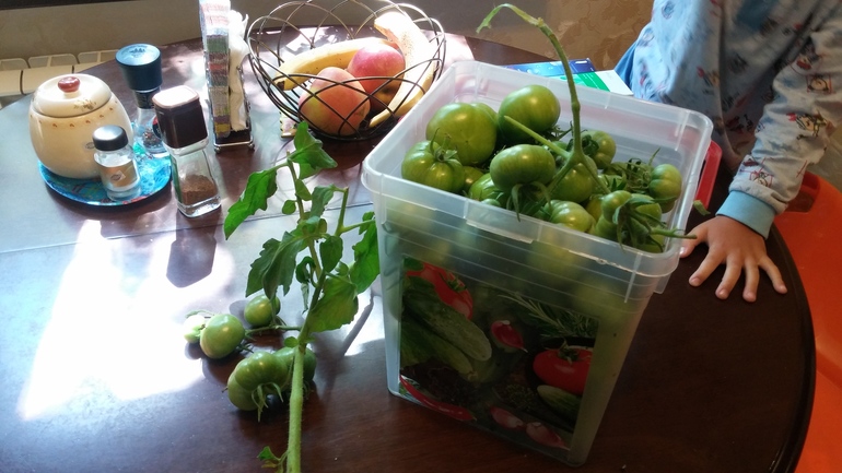 это с 5 кустов. все зеленые. часть на дозревание, часть на засолку. Сажала рассадой впервые и вообще все - впервые. :)