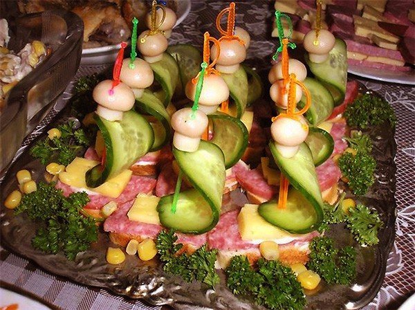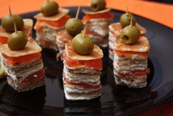 Очень эффектно смотрятся многослойные канапе. Несмотря на длинное описание, готовятся они очень просто. Нарезать одинаковые по толщине куски черного и белого хлеба. Лучше брать «кирпичик», чтоб куски были квадратной или прямоугольной формы. Кусок черного хлеба намазать сливочным сыром, выложить тонко нарезанные огурцы и посолить. Белый кусок хлеба смазать сливочным сыром и выложить смазанной стороной на огурцы. Теперь смазать сливочным сыром верх белого куска, на него выложить рыбу, накрыть смазанным куском черного хлеба. И повторить действия, прослоив, например, тонкими кусочками болгарского перца или помидора. Завершить куском белого хлеба. Сборка чем-то напоминает сборку торта. Воткнуть шпажки в многослойный бутерброд на одинаковом расстоянии. Между шпажками разрезать бутерброд накрест на квадратики, на каждой шпажке остается многослойное квадратное канапе.