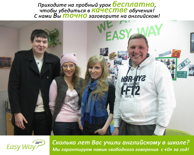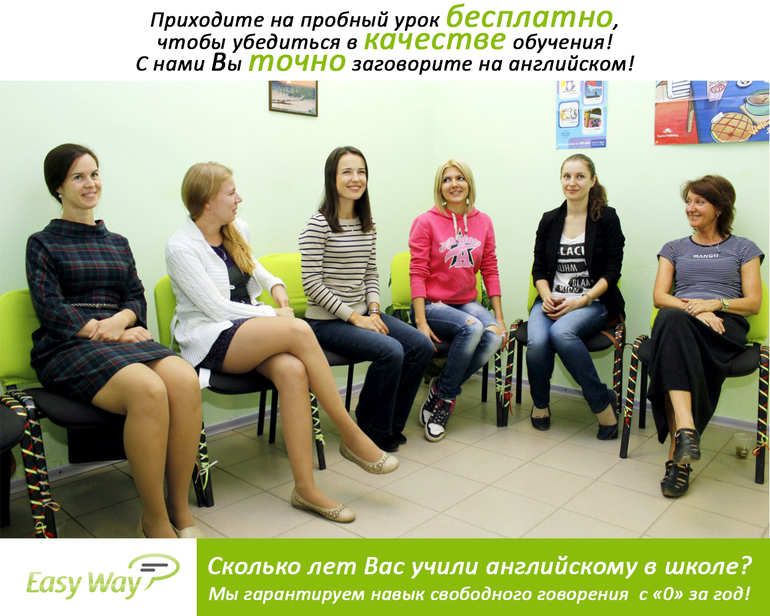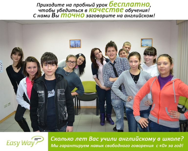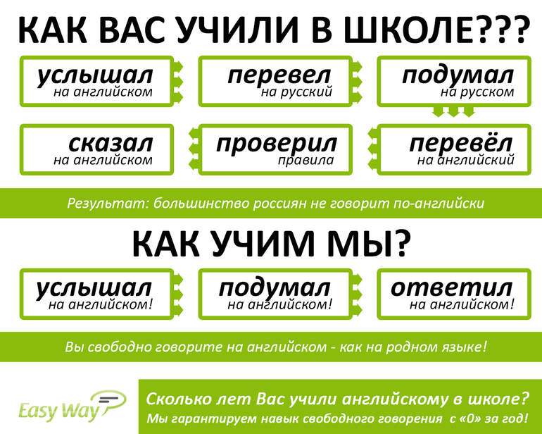 Мы предлагаем курсы английского по методике "easy way", где мы учим людей думать и говорить на английском, избегая схемы: услышал на английском, перевел на русский, подумал на русском, сформулировал на русском, перевел на английский, проверил правила и сказал на английском! Вместо этого: услышал-подумал-ответил все