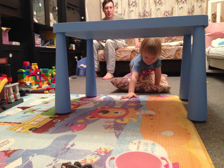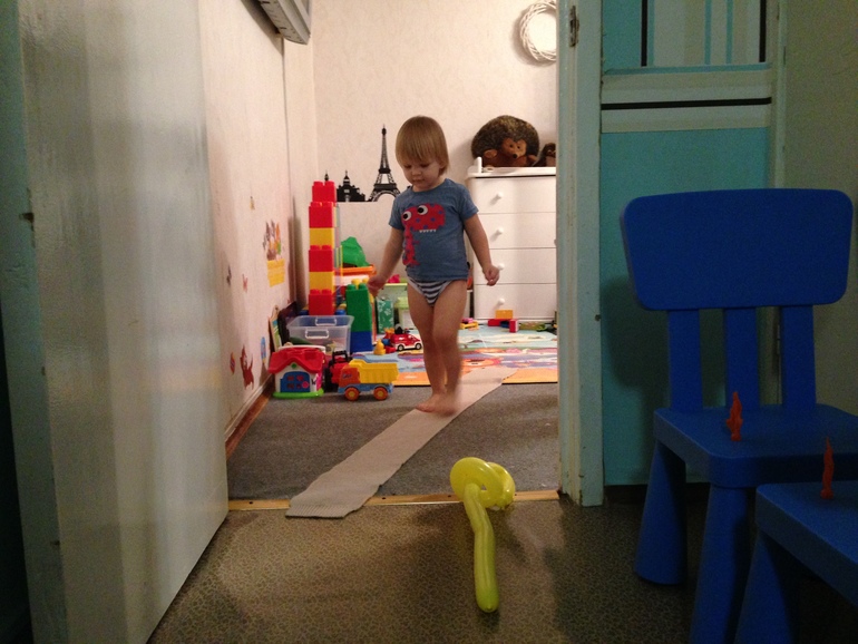 Леве очень понравилась полоса препятствий. Преодолеть их нужно было перед тем как потушить пожар из шланга-воздушного шарика. Пролезть по мостику из подушек, проползти под столом, собрать рассыпанные морские камешки и пройти по шарфу-доске. Тут даже папа поучаствовал.