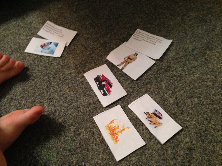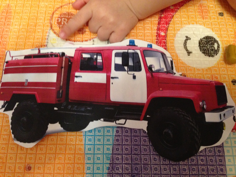Пытались отгадывать загадки - отгадал те. что в рифму. Остальное подсказала и объяснила. Вырезали пожарного, пожарную машину и разные пожарные приспособы. Лева все "складывал" в машину и следил чтобы пожарный ничего не забыл.