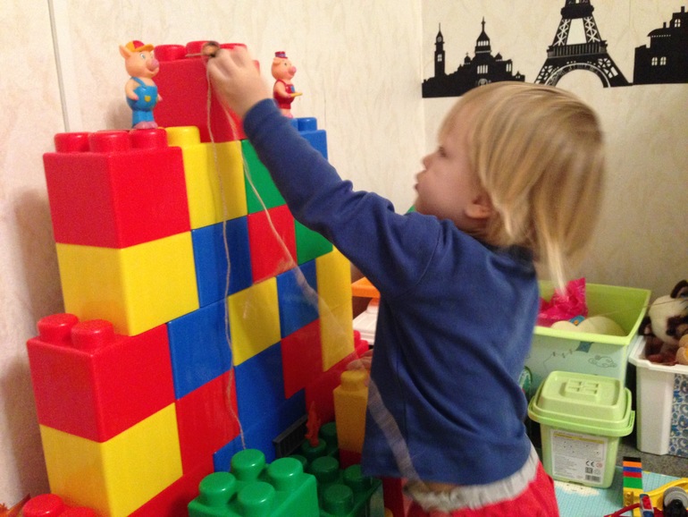 В течение дня мы несколько раз играли в пожарных. Строили дома и тушили пожары. В помощь нам конструктор Лего в пожарной машиной, шлангом, пожарными и пожарной частью. Выясняли зачем пожарному какие инструменты и имитировали ситуации когда эти инструменты могут пригодится.