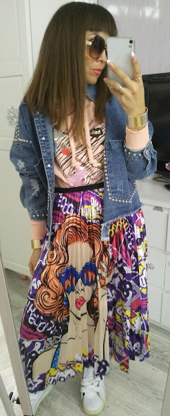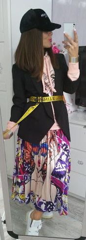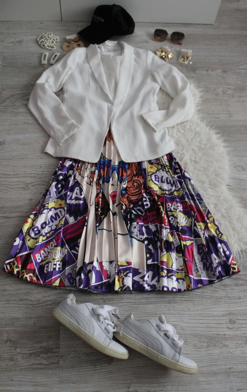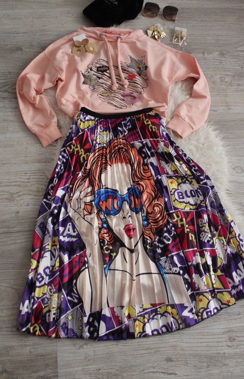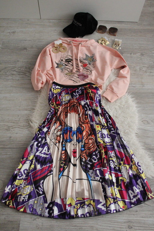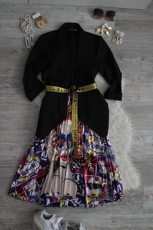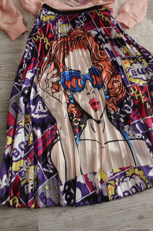 Атласная плиссированная юбка с ярким абстрактным принтом, который стала ключевым мотивом runway-коллекции бренда Valentino. Длина миди, верх на поясе-резинке.