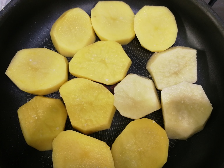 В форме для запекания разложить толстые ломти сырой картошки и присолить: