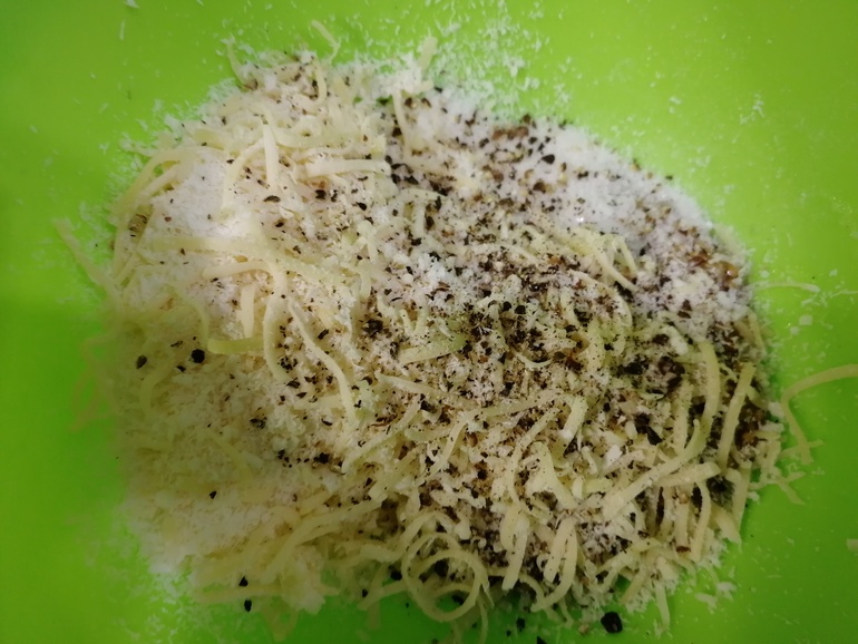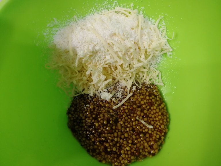 В миску положить 2 ст.л. зерновой горчицы, половину стакана натертого сыра: