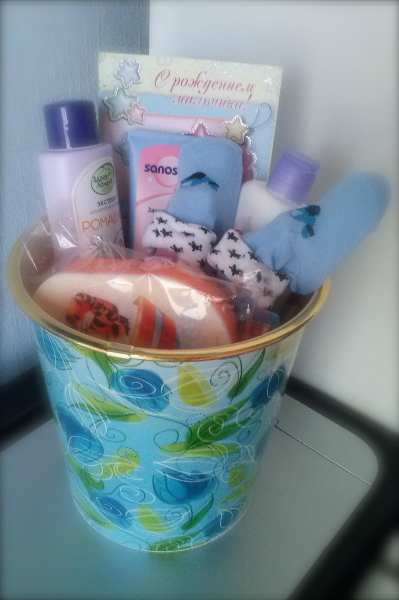 у нас тут у знакомых сынок родился)) очень хотела сделать торт из памперсов иличто то такое. но в итоге получилось ведро и без памперсов)))