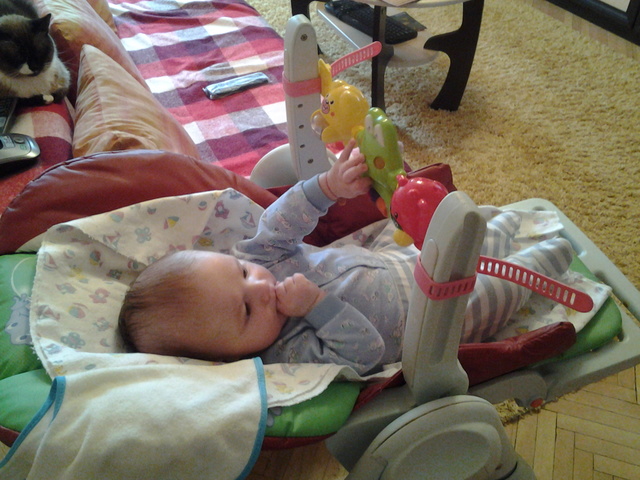 Сегодня были у педиатра. Вес 7260 кг, рост сначала сказали не меряют в 4 месяца, но пациентов не было и нам померили, в общем рост 66 см. Сказали, что все у нас хорошо. Анализы крови и мочи нормальные, только низковат гемоглобин, у нас 104, другая врач сказала, что это нормальный показатель для 4 месяцев. В общем мнения разделились. Через месяц еще раз надо сдать кровь, тогда посмотрим пить железо или нет. А еще у нас первый зубик, врач увидела, показала, я ничего не увидела. Пришли домой я решила помазать сыночку десенки и пальчиком укололась об краешек зубика, он еще совсем совсем маленький, видно только начинает прорезаться, а я то думаю, почему последнюю неделю деть беспокойный стал и по ночам часто просыпается, думала скачок роста, а оказывается зуб.