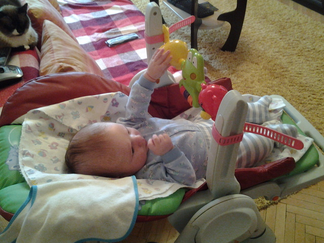 Вот и закончили мы первый курс массажа, последние 5 сеансов Ванечка уже не плакал, наоборот активно улыбался во весь беззубый рот массажистке. Очень ему понравились наклейки паровозики на стенах в кабинете массажистки, все сеансы глаз от них не отрывает. Результат от массажа налицо: тонуса больше нет, ручки в кулачках больше не держит, полюбил лежать на животе, вовсю ползает, как юла, так смешно носом кровать роет. Полюбили музыку, теперь лежит в коврике и слушает Моцарта. Постоянно следит за передвижениями мамы и папы по квартире и если оставить одного в комнате больше, чем на 5 минут начинает нас звать, при этом не плачет и не хнычет, а просто бурчит, визжит. Переворачиваться мы так и не хотим, зато сидеть очень торопимся.