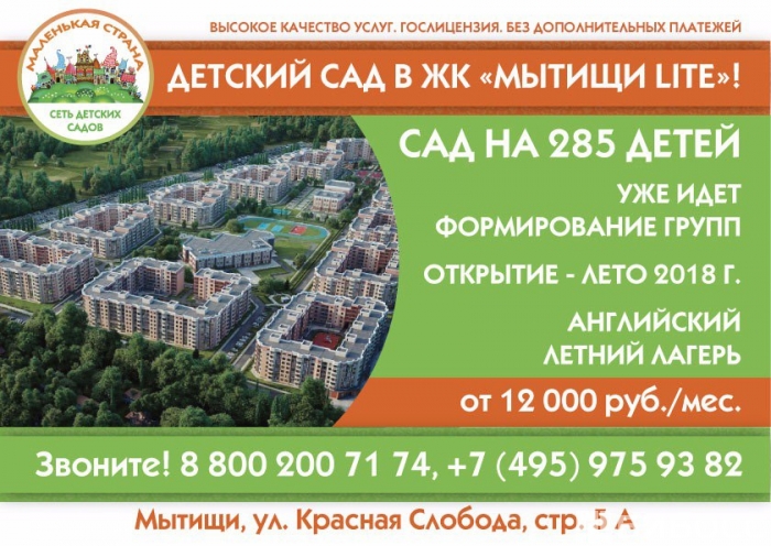 «Маленькая страна» - это детский сад нового формата, работающий по современной программе «Мозайка-парк», а также особой авторской методике изучения английского языка LEARN by PLAY (Изучай играя). Сад будет рассчитан на 285 мест, а записаться в лист ожидания можно уже сейчас в офисе продаж на объекте. Об открытии учреждения всем жителям ЖК «Мытищи Lite» будет сообщено дополнительно."