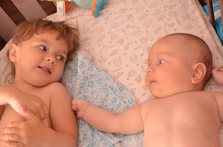 Сестренкой Ваня интересуется, но опасается ее. Она может и в ухо крикнуть, не со зла, и пнуть случайно. А так очень пока неплохо складываются отношения.